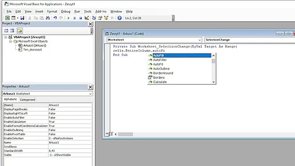 Kliknij prawym przyciskiem myszy na zakładkę arkusza (np. „Arkusz1”) i wybierz „Wyświetl kod”. Otworzy się edytor VBA. Na górze wybierz Worksheet, a z listy po prawej SelectionChange.